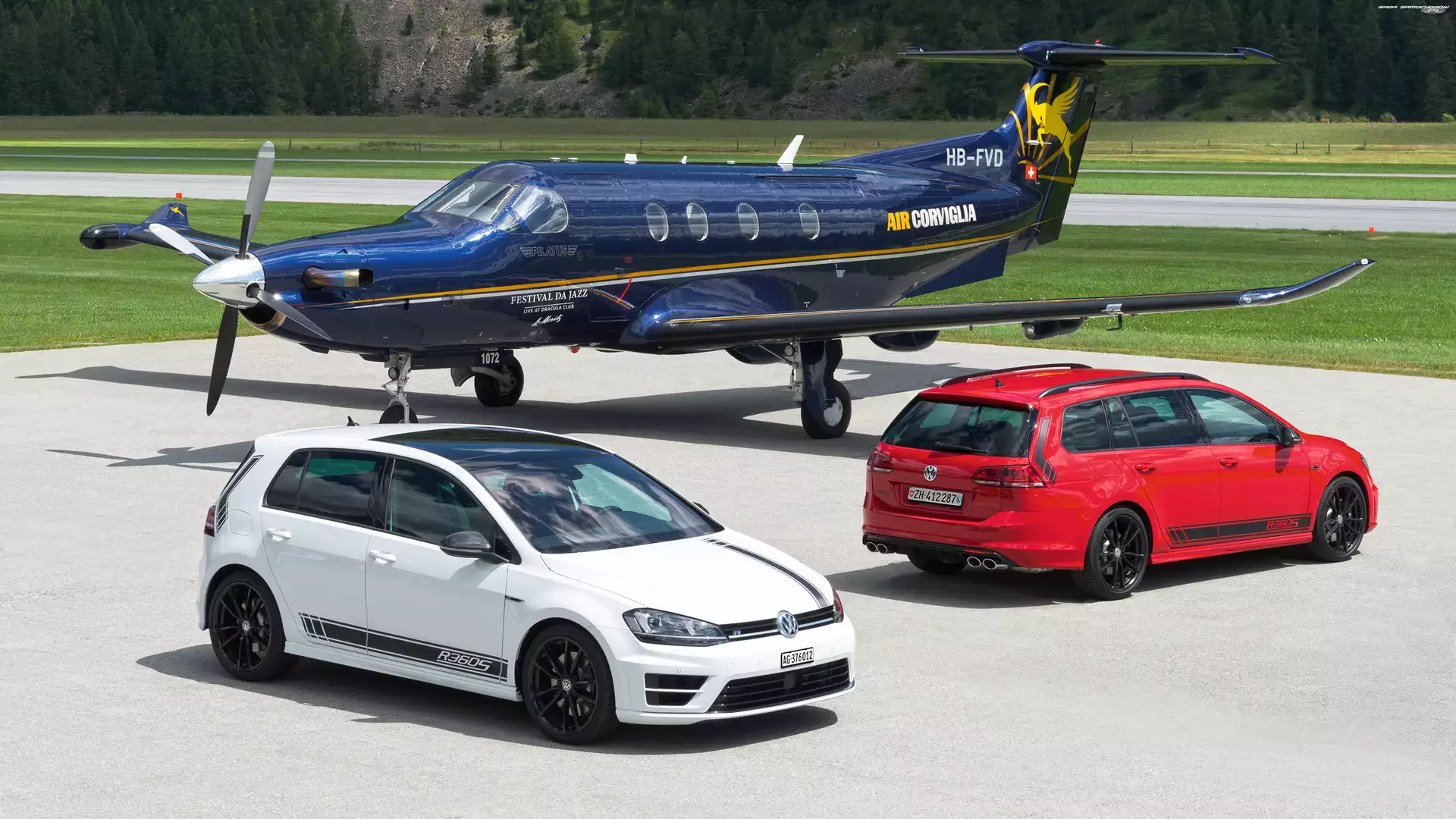 Samochód: Pilatus PC-12, Biały, Dwa, Volkswagen Golf R360S, Samolot, Samochody, Czerwony